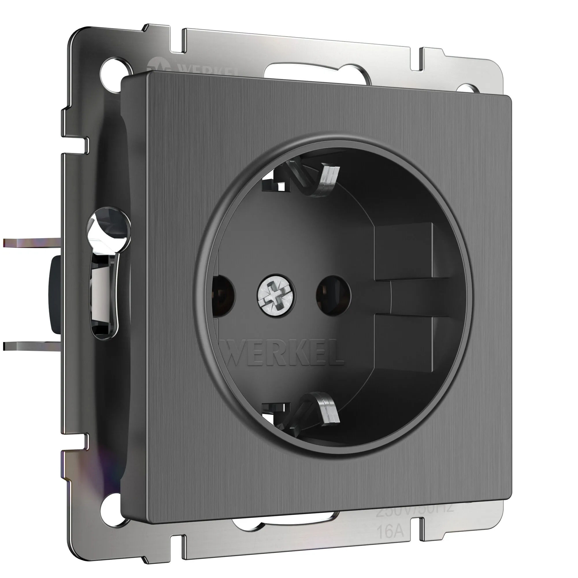 Лицевая панель выполнена в графитовом цвете с рельефной фактурой и тактильной мягкостью. Такая поверхность не бликует, не притягивает пыль и идеально вписывается в любые стили — от скандинавского минимализма до лофта и классики. Гармонично сочетается с любыми отделочными материалами, а универсальная совместимость со всеми рамками Werkel позволяет создавать индивидуальные композиции под ваш вкус.